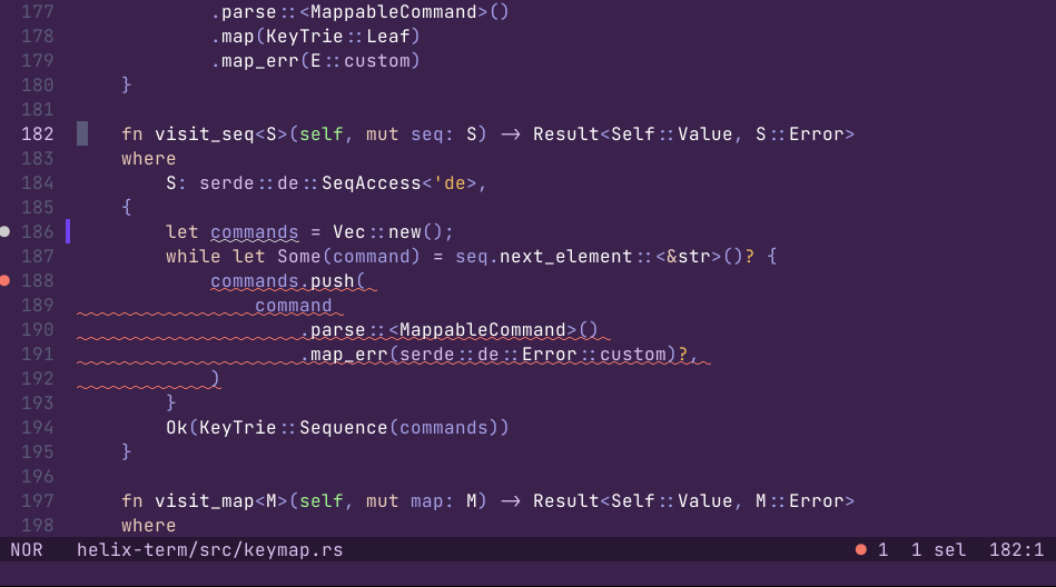 24.03 also saw major internal improvements. The first comes from a new “event system” - a system built around Tokio channels and tasks that allows different parts of the Helix codebase to communicate with one another. The event system also adds generic ways to debounce and run tasks in background threads so we can prevent locking up the UI. Some parts of the code base have already been migrated to the event system like LSP completion and signature-help. In 24.03 you’ll notice that LSP completion doesn’t automatically pop up after just navigating around in insert mode, for example with arrow keys. It’s now hooked into document changes instead, so it can smartly pop up when you start changing a document rather than every time the editor goes idle.